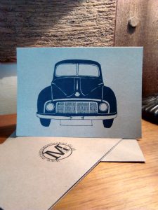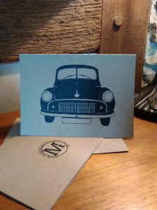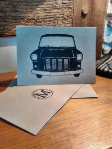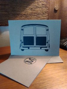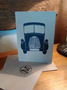 Cards Each card is designed and silk screen printed by hand in our workshop. 5X7″ Greetings card with envelope .